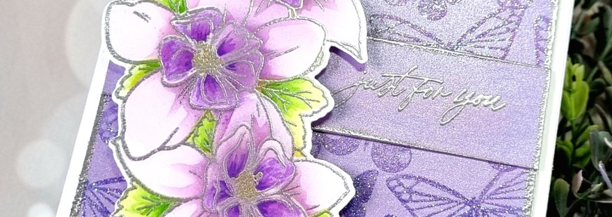 In the second card I used the Fluttering Butterflies bold print cling stamp. I used a combination of different reactive inks from the Floral Palette reactive ink cube set, Thistle at the top, Grape Slush for the middle and Purple Galaxy at the bottom. After stamping it, I stamped it again with embossing ink and this time I used the Sparkle embossing powder for that shimmery look..