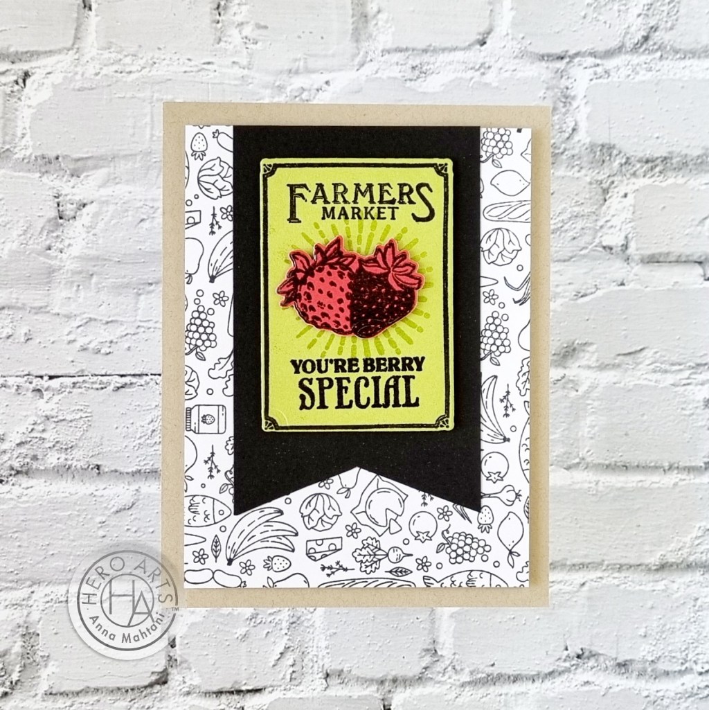 Hello! Hope you are having a good week so far! This month’s Hero Arts release is so much fun! It’s all about the Farmer’s Market and all the fruits and veggies you can find there!