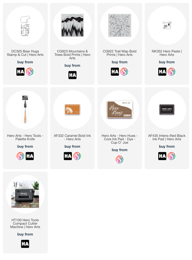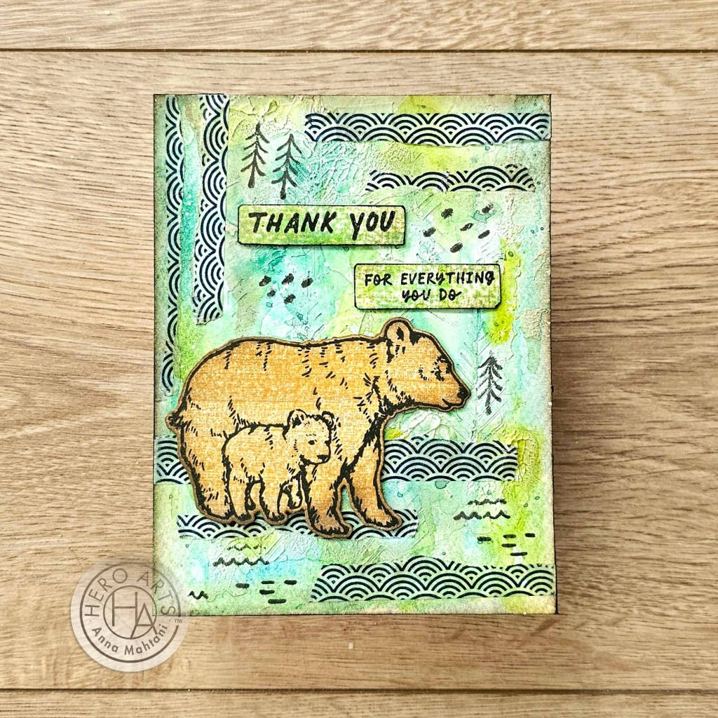 While it was drying, I took some Hero Arts Caramel & Cup o’ Joe core inks and swiped them on a piece of Dove white cardstock. Then I stamped the image of a mama bear and her cub from the Bear Hugs stamp & cut stamp set with Intens-ified black ink and used the coordinating die to cut it out.