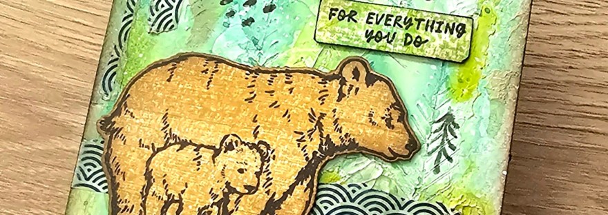 I also used the Trail Map Bold Print cling stamp and selectively stamped the images all over the panel. Then I added the mama bear and her cub with dimensional foam tape. Then sentiment is from the same stamp set, stamped with Intens-ified ink on a green and blue ink swiped background – cut out by hand and added onto the panel.