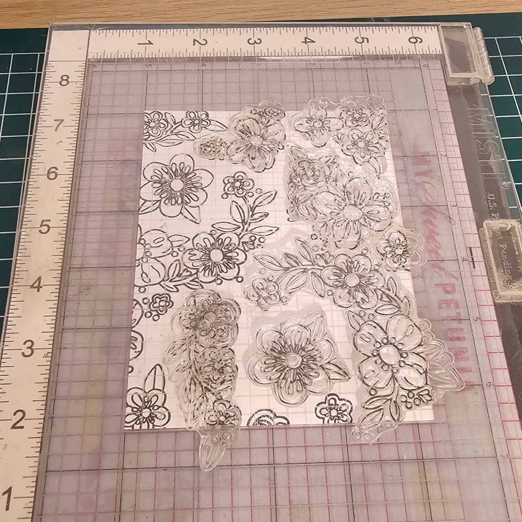 To make this card, I used the Bold Flowers stamp set from Hero Arts. I took all the flower cluster stamps and laid them out on a panel of cardstock in my Misti stamping tool. I then stamped it out with black ink to create a sort of template for an over all pattern. I keep this template at the back of my stamp set so I can pull it out anytime I want to create the same overall pattern design.