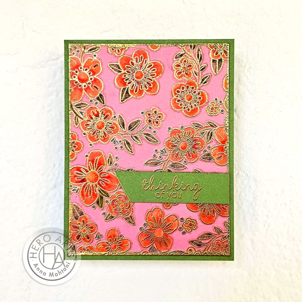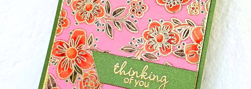 Then I trimmed it 1/8th of an inch on all sides and gold heat embossed the edges before adhering it onto a Meadow green cardbase. I then added a gold heat embossed sentiment “thinking of you”, also from the same stamp set.