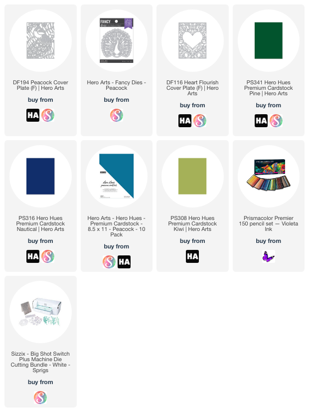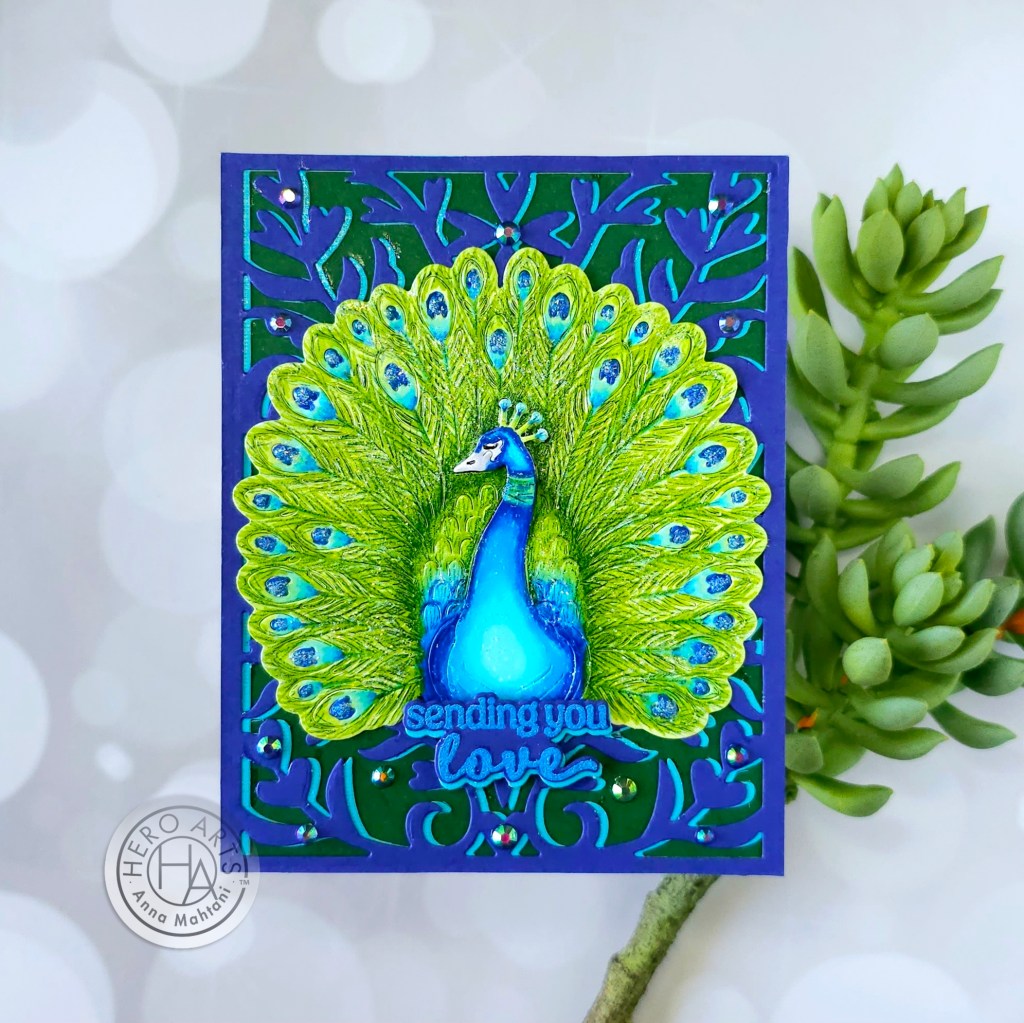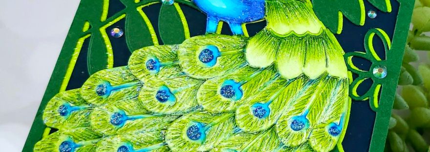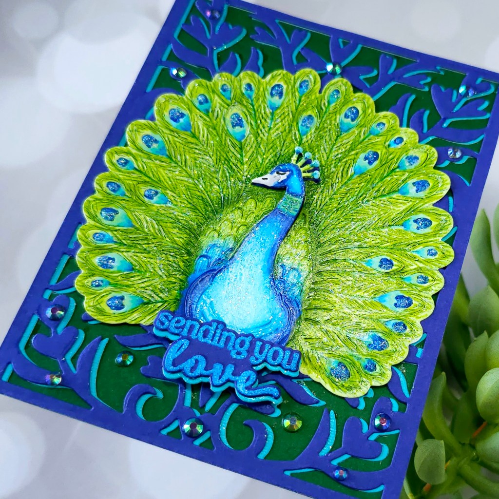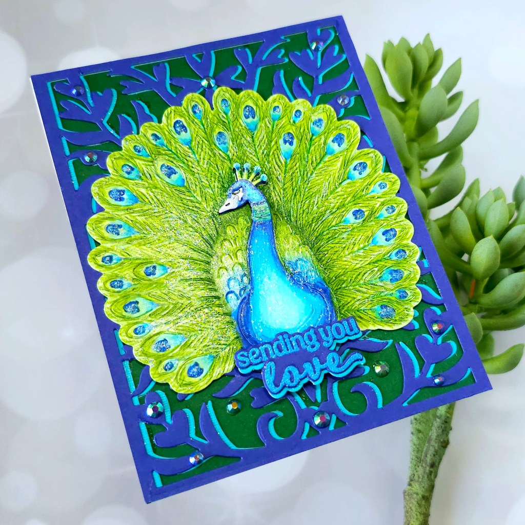 Hello! I am sharing a card I created using alcohol markers and colored pencils to color these beautiful die cut peacocks.