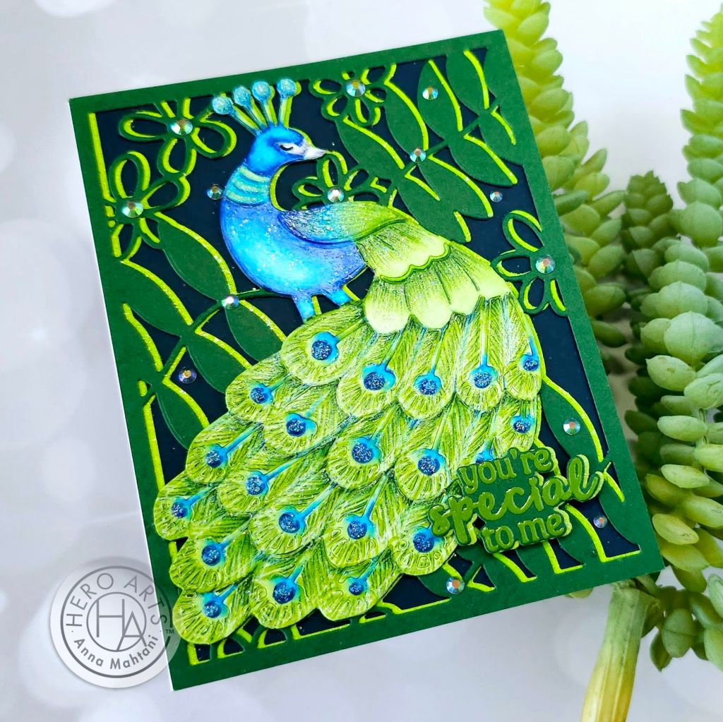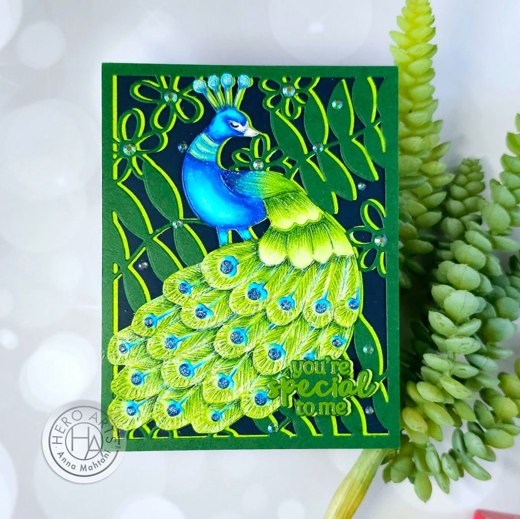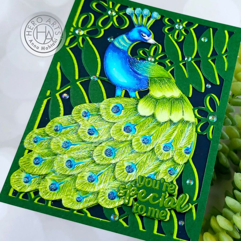 For the background, I used the same peacock cover plate and die cut it using Hero Hues Pine Cardstock and Hero Hues Kiwi and adhered it offset on a piece of Hero Hues Nautical cardstock panel.