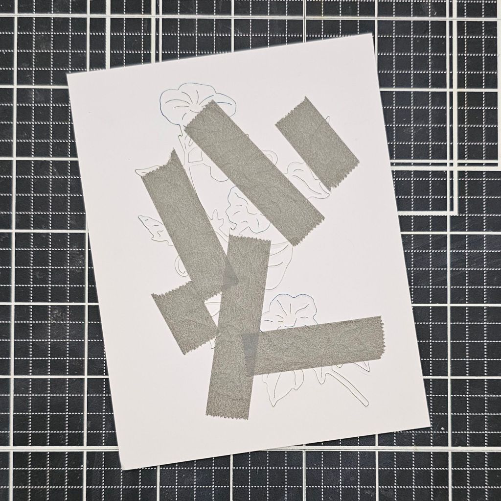 First, I die cut the Morning Glory out of white cardstock, but kept the die cut still connected to the paper by adding washi tape at the back.