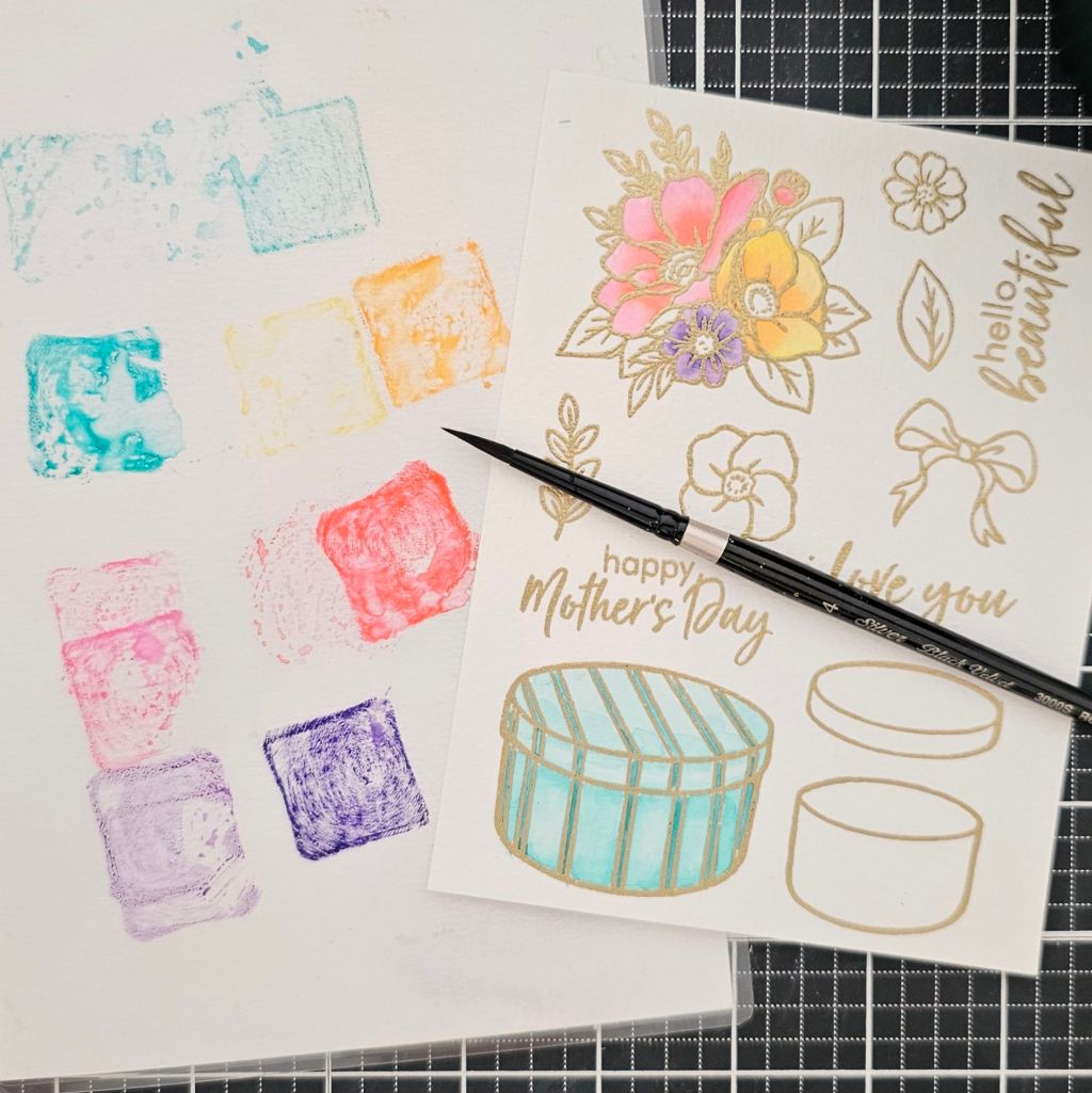 The ink colors I used for the images were namely, Taffy & Creamsicle for the biggest flower & the ribbon, Lemon Drop &  Creamsicle for the medium flower and Lilac & Purple Galaxy for the smallest flower. The leaves were painted with Key Lime Fizz & Green Apple, the hat box with Pool Party. Then I used colored pencils in the darker shades to add depth to the images.