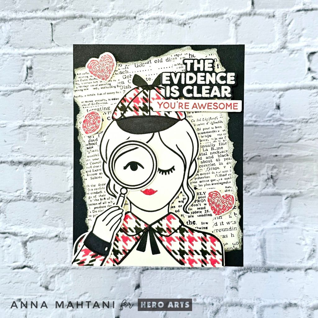 Then I added the sentiment “The evidence is clear” white heat-embossed on Pitch black cardstock and die cut using the coordinating die. The sentiment is from the It’s No Mystery Stamp & Cut set. Then I added “You are Awesome” sentiment below stamped on Alabaster cardstock with Cherry Core Ink.