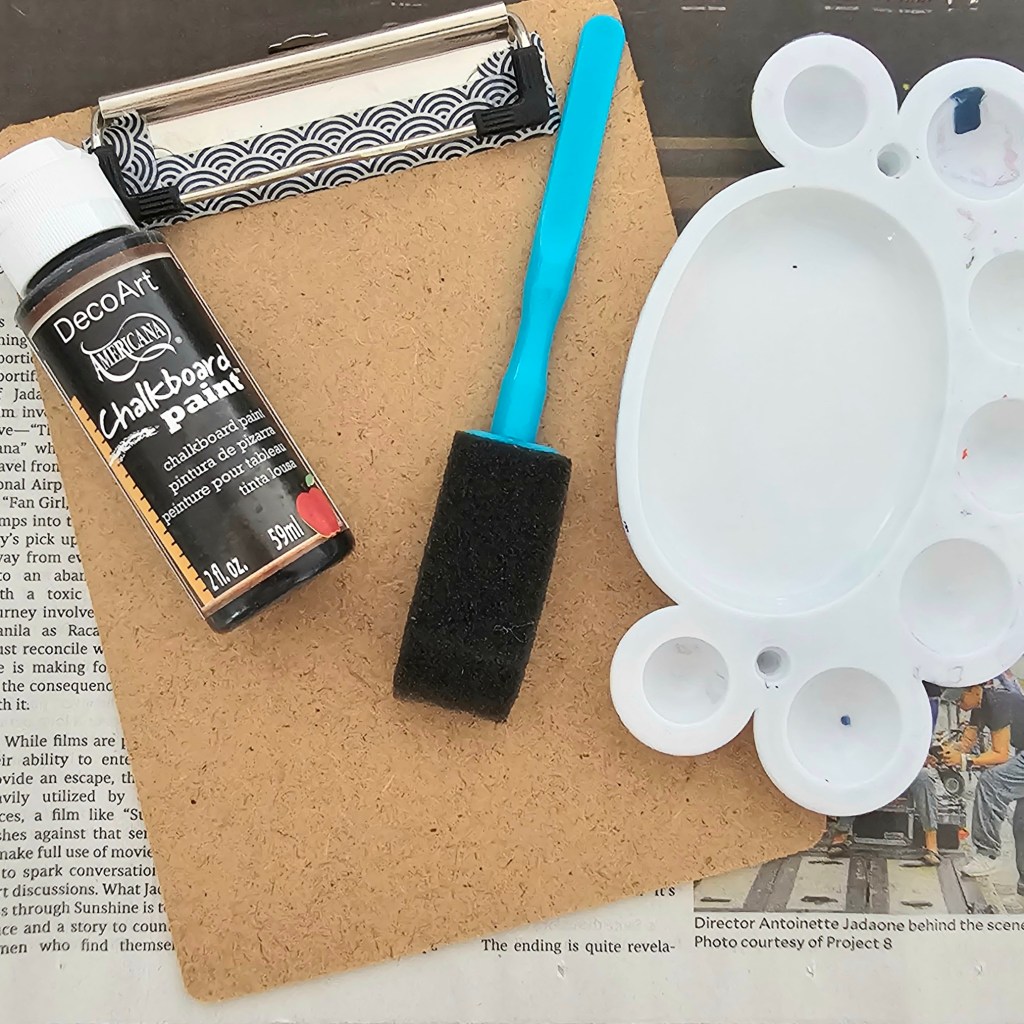 First. I took an ordinary clipboard made out of chipboard and masked off the steel clip with washi tape. Then I applied three coats of chalkboard paint with a foam brush, making sure the paint was dry between coats.