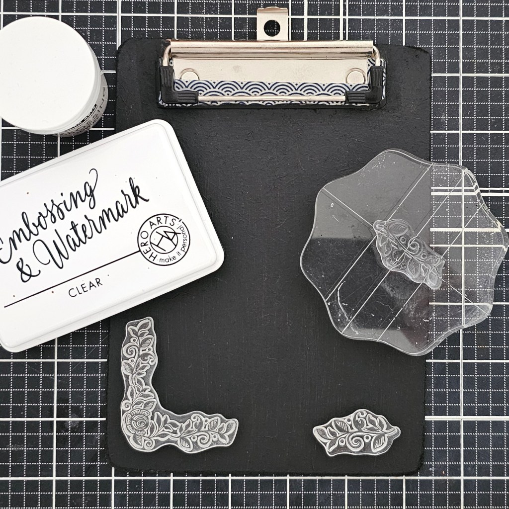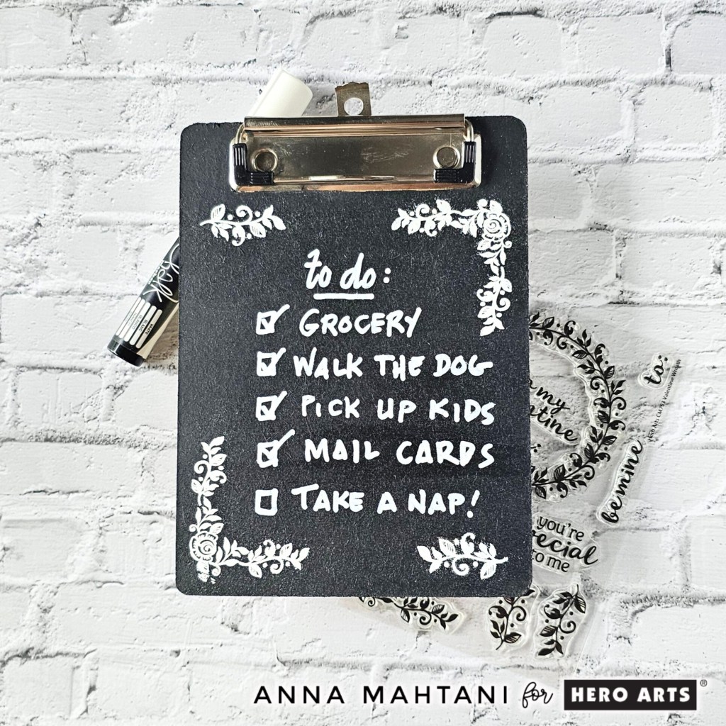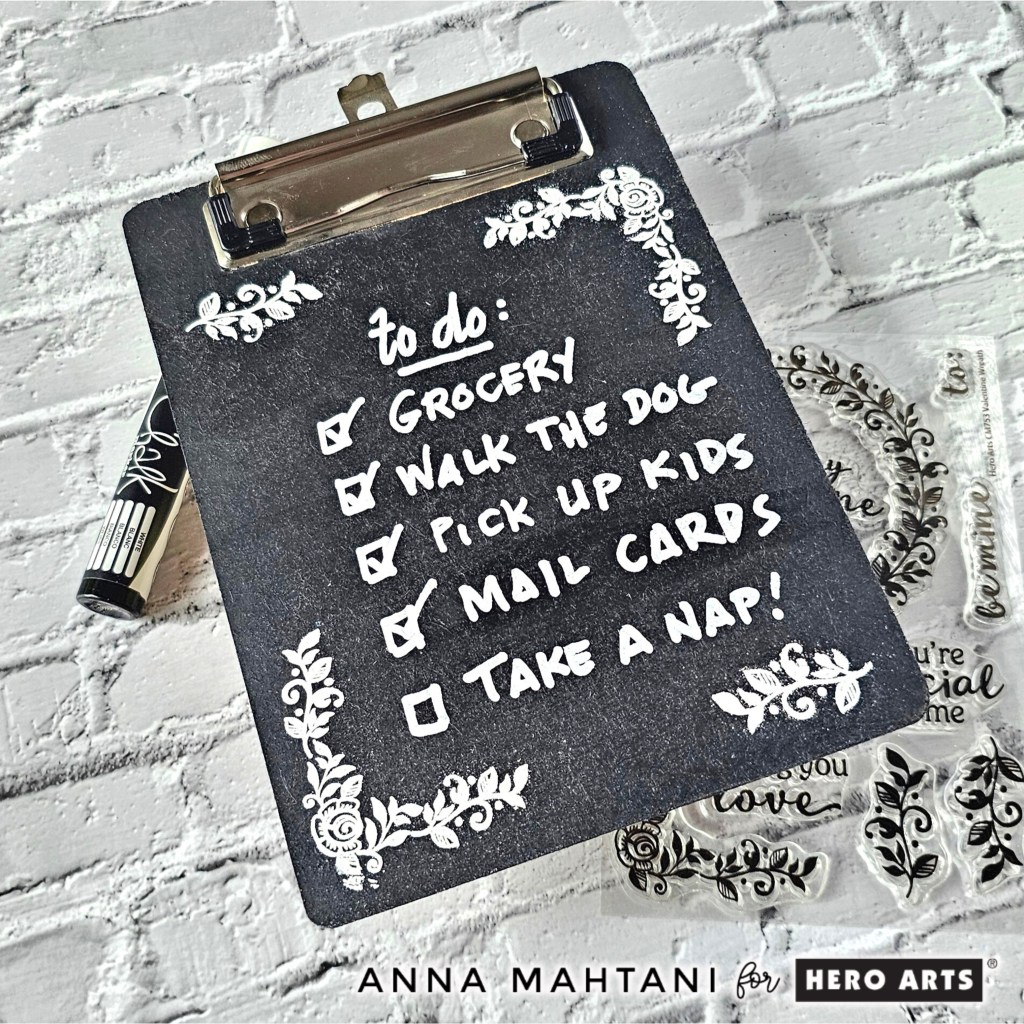 Hello! Anna here with another clever craft project. This month, I am showing how to turn an ordinary chipboard clipboard into something decorative yet functional. All you need is your favorite Hero Arts stamps and items you can find in any art store or office supply store.