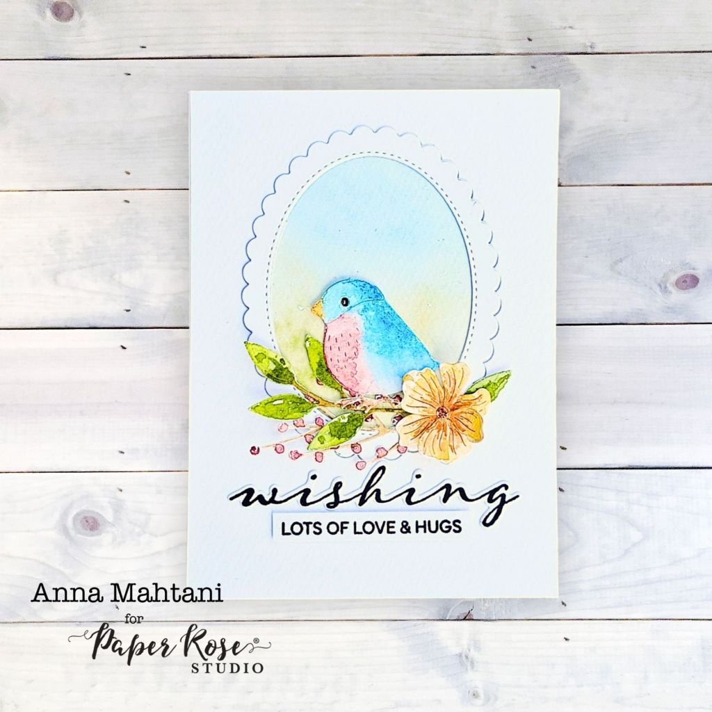 Then I framed it with the scalloped oval frame also from Paper Rose Studio. Then I paired it with the sentiment “Wishing lots of love & hugs” from the Wishing & Sending Sentiment stamp and die set.