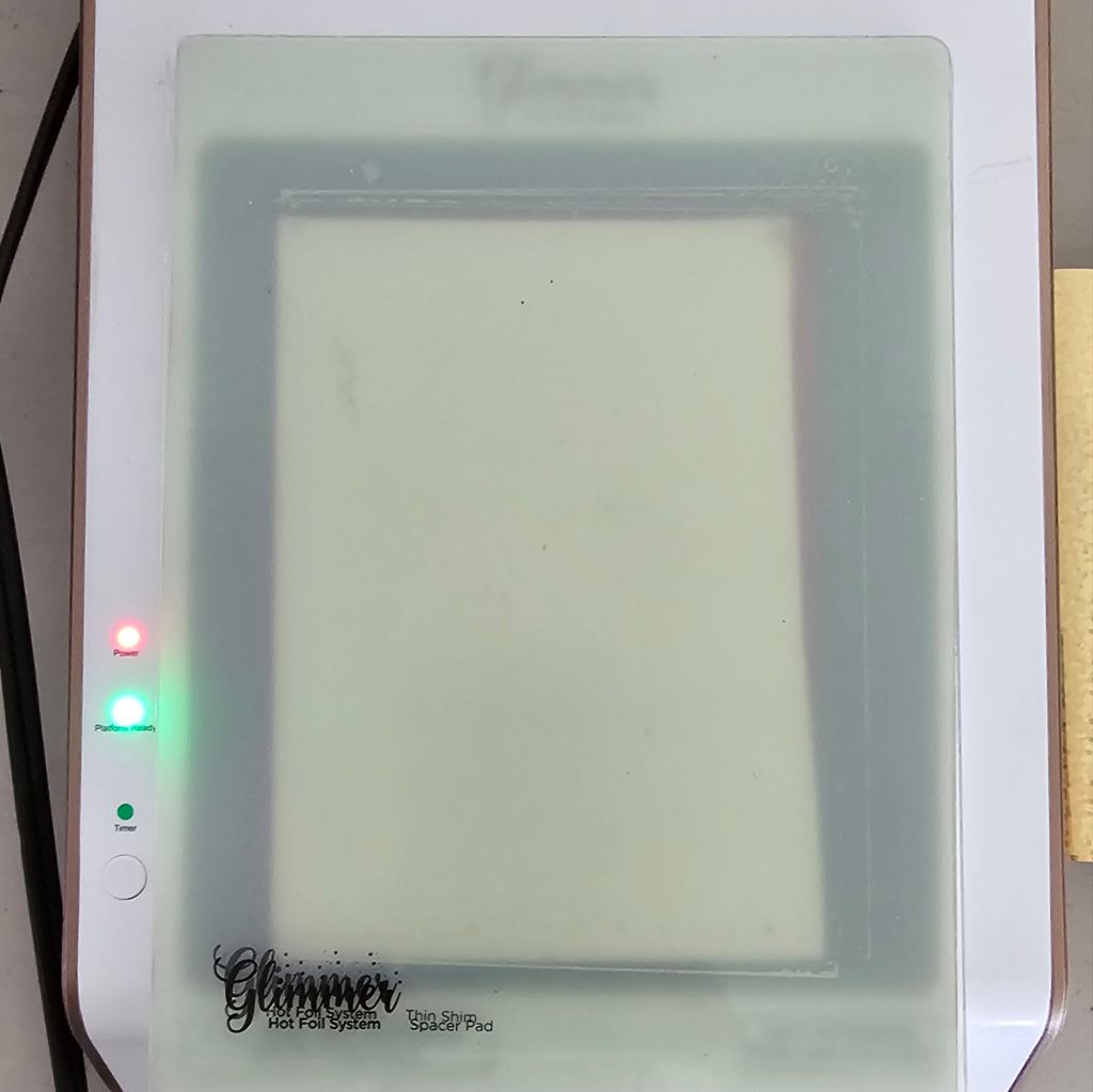 After placing the hot foil plates facing up and using the alignment guide to put them in place, I removed the alignment guide, turned on the machine and then placed the gold speckled aura foil SHiny side Down on the plates.