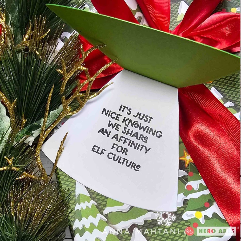 Next, I stamped the sentiment “It’s just nice knowing we share an affinity for elf culture” on the inside with Intens-ified Black Ink. The sentiment is from the Elf Culture stamp set as part of the release. Then I punched a hole at the top and added a red gross grain ribbon from my stash.