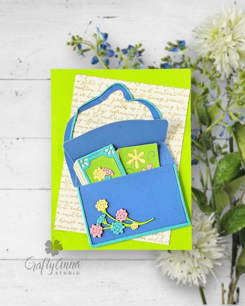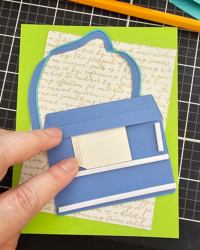 Then I freehand cut the straps for the bag using the same blue cardstock and decorated the edges with thin strips of Peridot cardstock by tracing and cutting it along the traced lines.