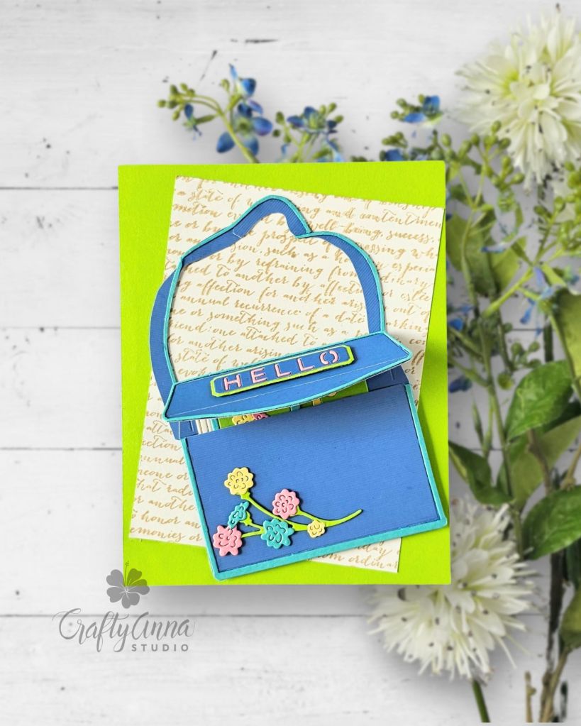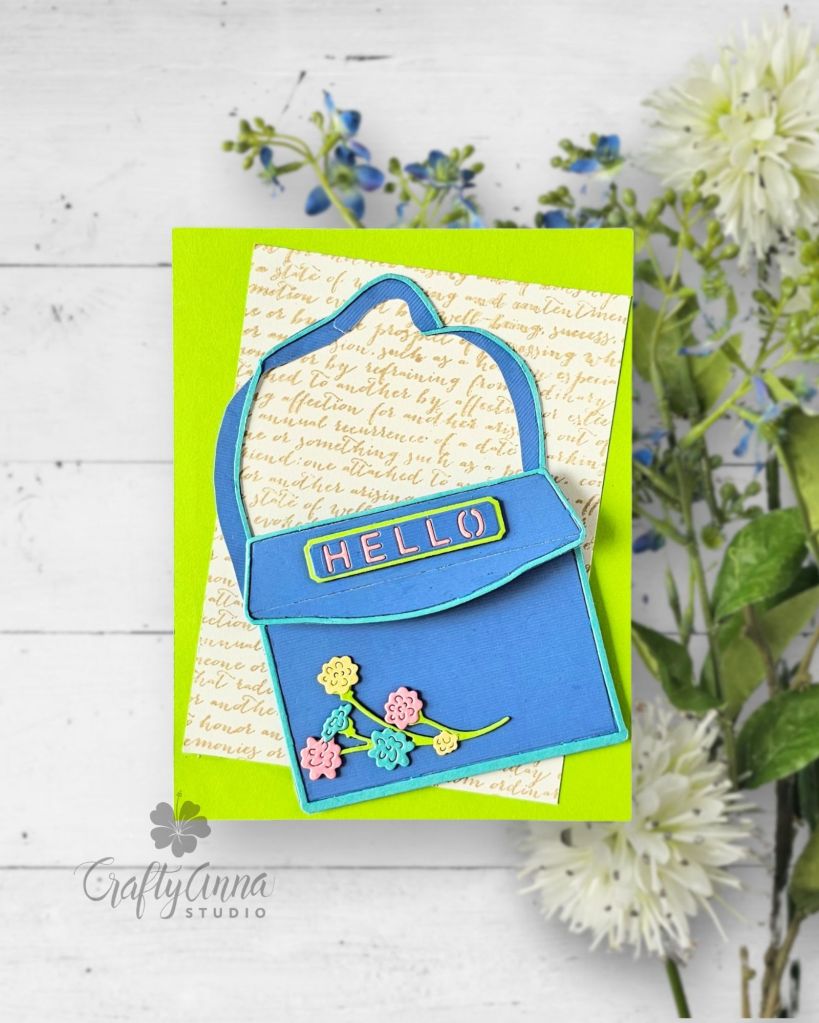 Next, I cut out the flowers and stems. Tutu, Teal Topaz and Beeswax for the flowers and Peridot cardstock for the stems. Then glued it on the front of the panel. I also die cut the word HELLO and paper pieced it and adhered it to the middle of the “flap”.